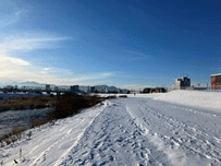 川と河川敷の区切っている白い柵は上の部分しか見えてなく雪融けはまだ先の様だ。